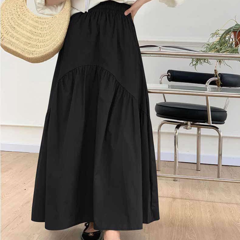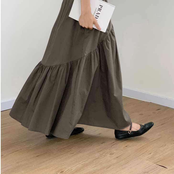 なめらかな生地感が特徴的なロングスカート。贅沢なティアード切り替えとギャザーのデザインで、動くたびに美しい揺れ感を演出。
